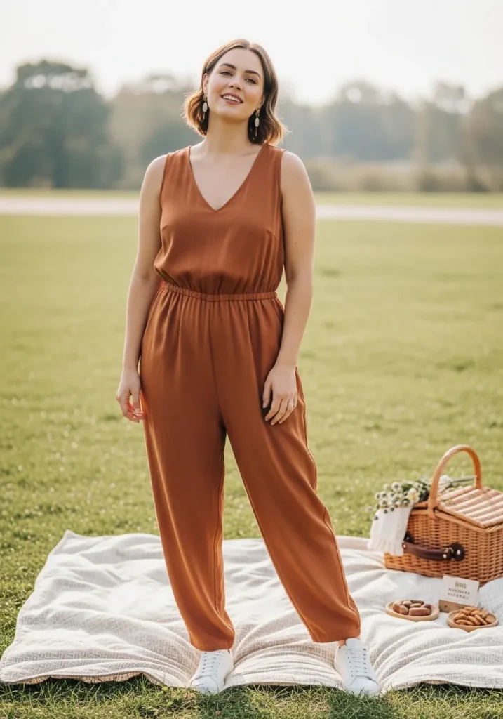A jumpsuit paired with sneakers creates a simple yet stylish outfit that’s perfect for picnics. The one-piece design makes getting dressed easy, while the sneakers keep the look comfortable.