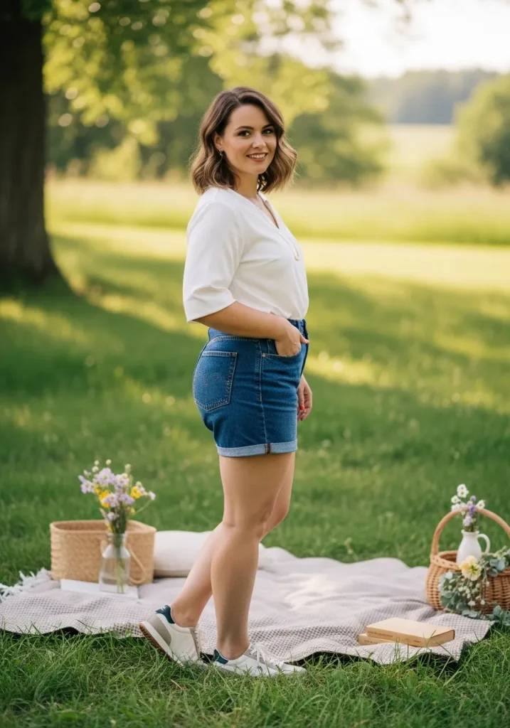 A white top paired with denim shorts and sneakers creates a classic and casual picnic outfit that’s both comfortable and stylish. The simplicity of the outfit makes it easy to wear while still looking clean and put-together.