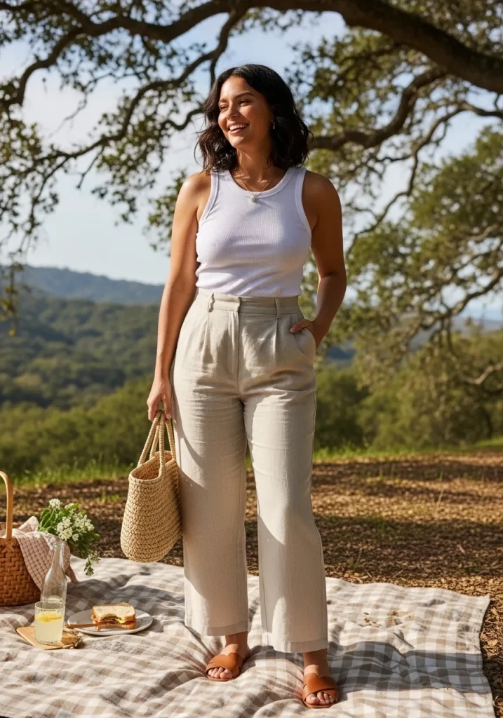 A ribbed tank paired with linen pants creates a breathable and stylish outfit that feels perfect for warm-weather picnics. The soft texture of the tank adds subtle detail, while the linen pants keep the look light and airy.