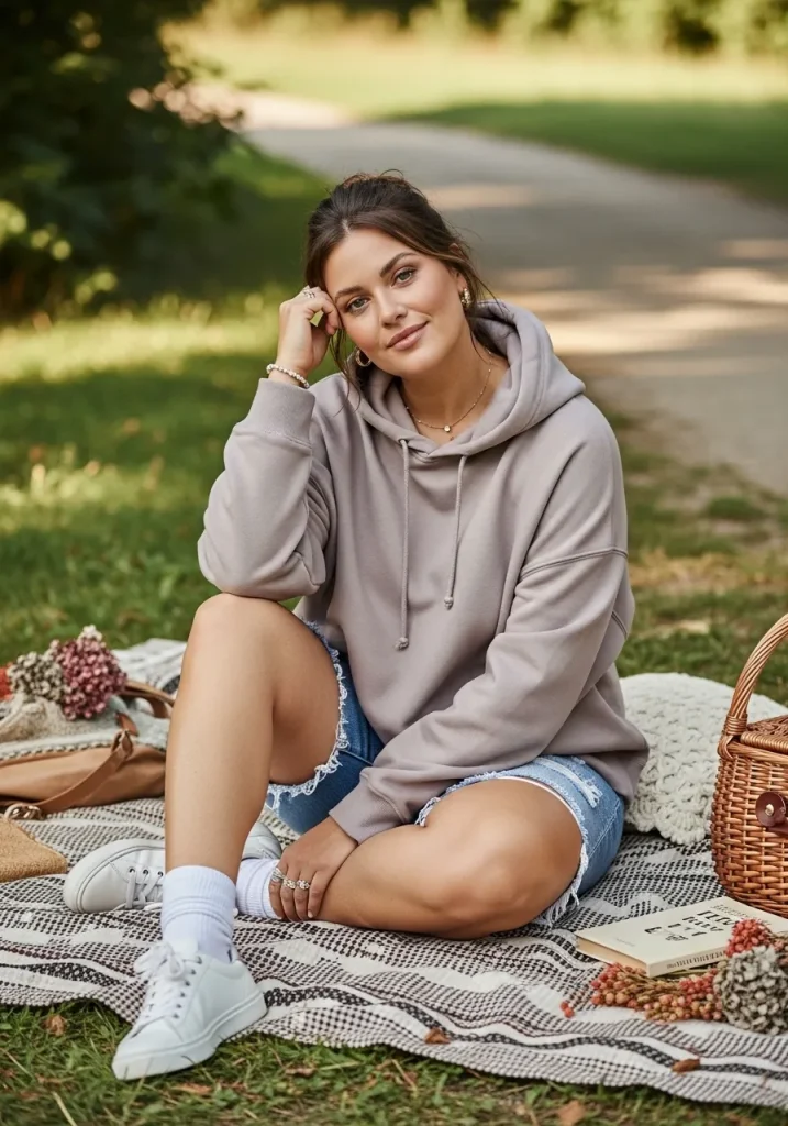 A hoodie paired with shorts creates a cozy and casual outfit that’s perfect for slightly cooler picnic days. The hoodie adds warmth, while the shorts keep the look relaxed.