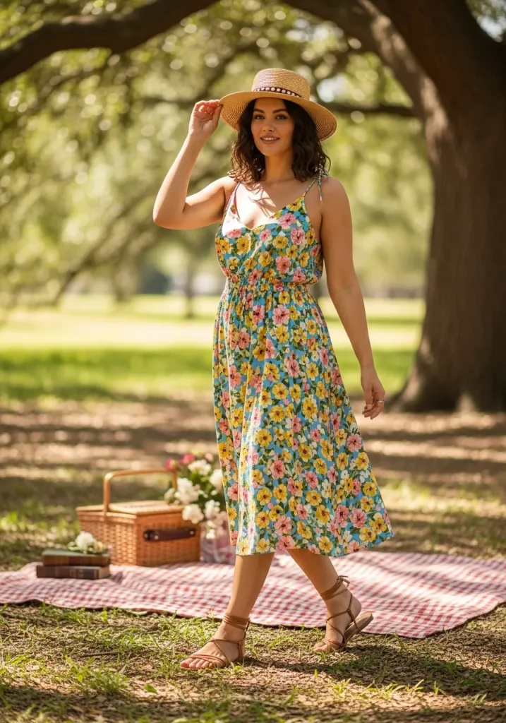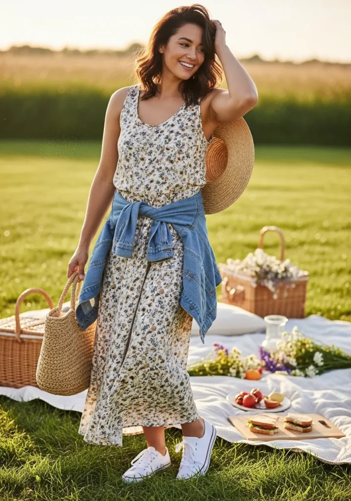 A sundress paired with a straw hat and sandals creates the ultimate dreamy picnic outfit. The flowy silhouette feels feminine and light, while the hat adds a stylish and practical touch for sunny days.