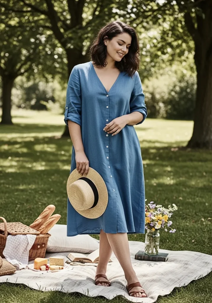 A button-up dress paired with sandals creates a simple yet polished outfit that feels perfect for picnics. The structured design gives the outfit a clean look, while the sandals keep it relaxed.