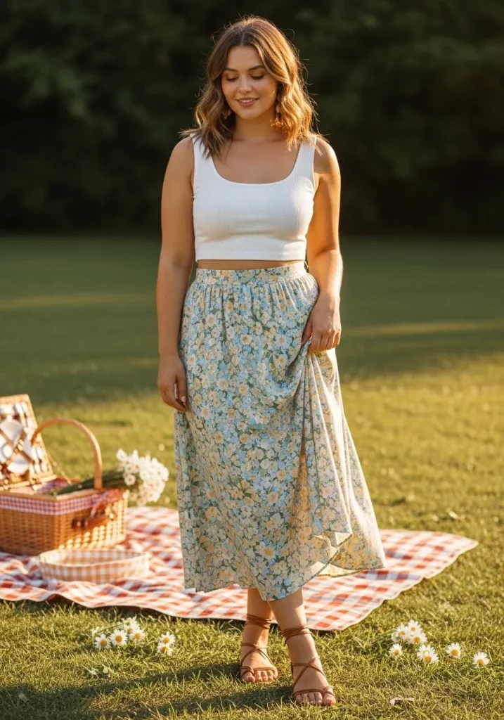A crop top paired with a high-waisted skirt creates a flattering and breezy outfit that feels perfect for warm weather picnics. The skirt adds movement and softness, while the crop top keeps the look modern.