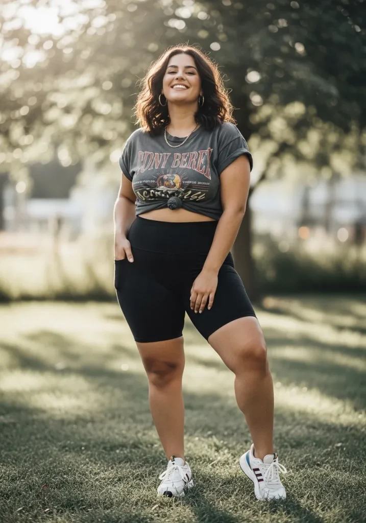 A graphic tee paired with biker shorts creates a sporty and comfortable picnic outfit that’s perfect for casual outdoor days. The relaxed fit keeps you comfortable while still looking trendy.