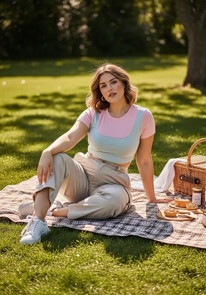 A crop top paired with cargo pants creates a trendy and slightly edgy picnic outfit that still feels comfortable. The cargo pants add structure, while the crop top keeps the look fresh.