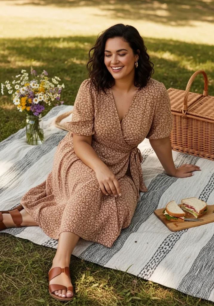 A wrap dress paired with sandals creates a flattering and feminine outfit that feels perfect for picnics. The wrap style enhances your shape while still being comfortable and easy to move in.