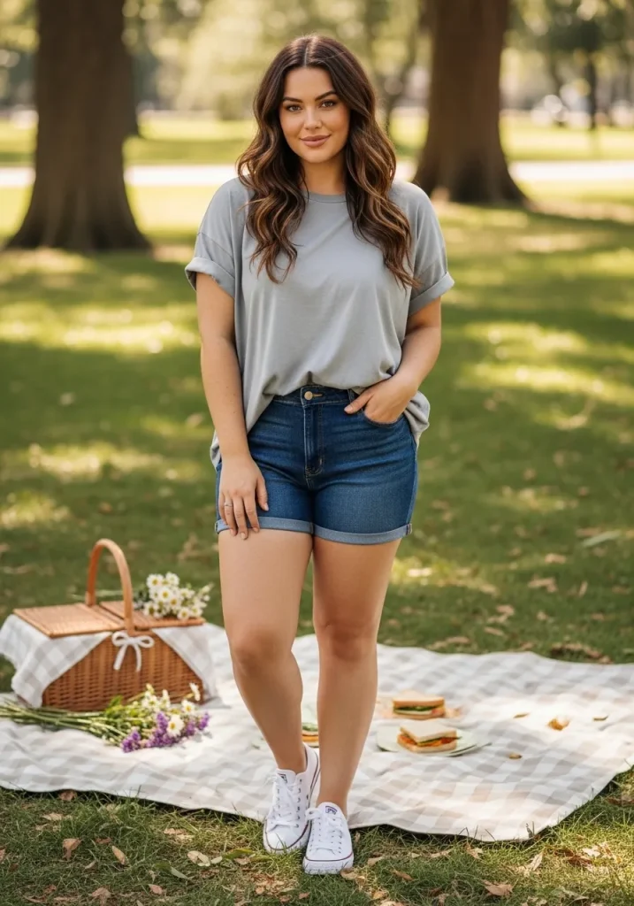 An oversized tee paired with denim shorts creates a relaxed and trendy outfit that’s perfect for casual picnic days. The loose fit keeps the look comfortable, while the shorts add a summery vibe.