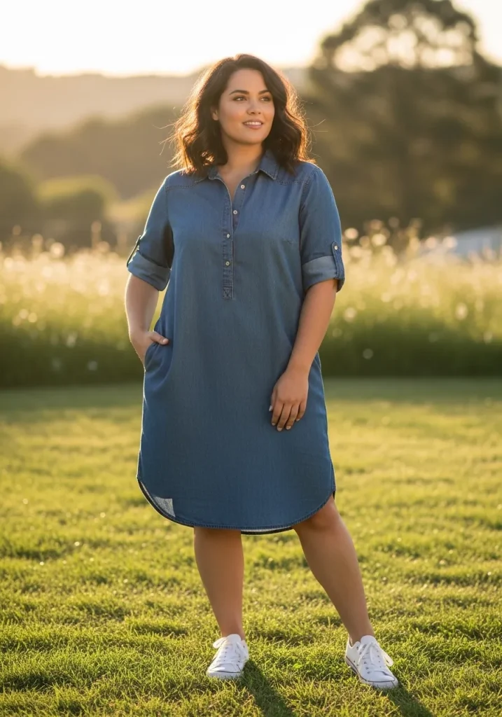 A denim dress paired with sneakers creates a casual and cute outfit that’s perfect for outdoor activities. The denim adds structure, while the sneakers keep the look relaxed and comfortable.