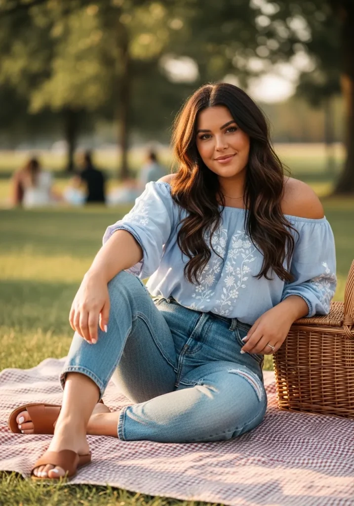 An off-shoulder top paired with jeans creates a soft and feminine outfit that feels perfect for slightly cooler picnic days. The neckline adds a stylish touch, while the jeans keep the look grounded.