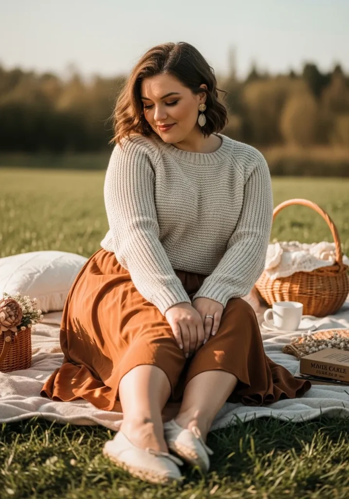 A knit top paired with a midi skirt creates a cozy yet feminine outfit that works perfectly for breezy picnic days. The knit adds warmth, while the skirt brings softness and movement.