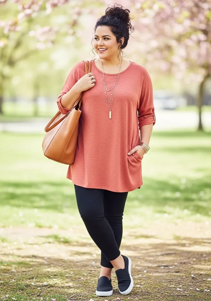 A tunic top styled with leggings is one of the most comfortable and easy spring outfits you can wear without sacrificing style. The longer length of the tunic provides coverage while still creating a flattering flow that feels relaxed and effortless. It’s perfect for days when you want to feel cozy but still look put-together.