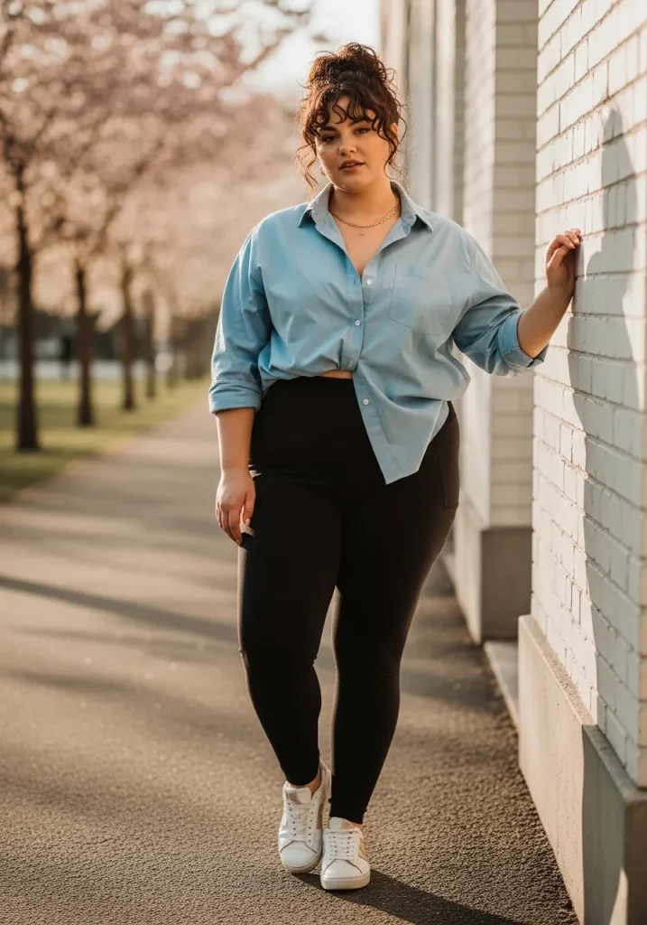 An oversized button-down shirt paired with leggings creates a relaxed and comfortable outfit that still feels stylish and put-together. The loose fit of the shirt adds an effortless vibe, while the leggings keep the look sleek and easy to wear throughout the day. It’s a great option for casual spring days when you want something simple but cute.
