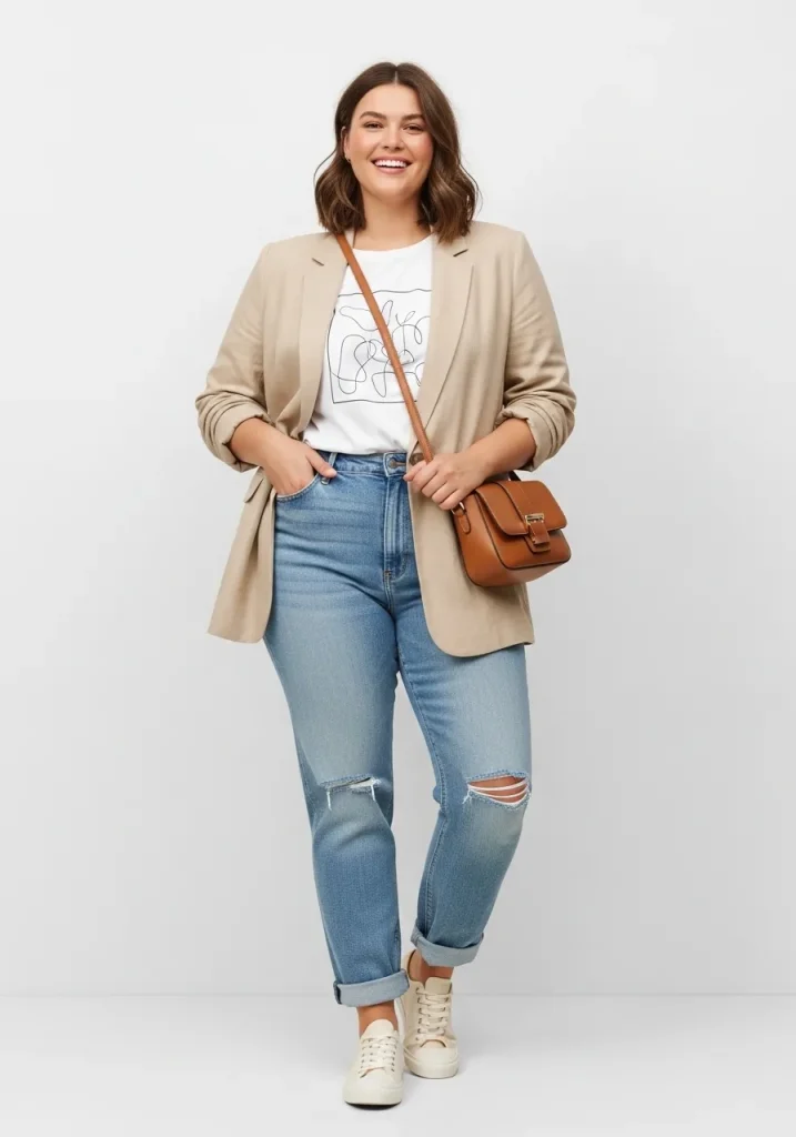 Opt for high-waisted or straight-leg jeans to create a balanced silhouette that feels flattering and modern. Pair the outfit with sneakers or loafers and add a tote bag for a functional yet stylish finish. This is the kind of outfit you can wear on repeat because it always looks effortlessly put-together.