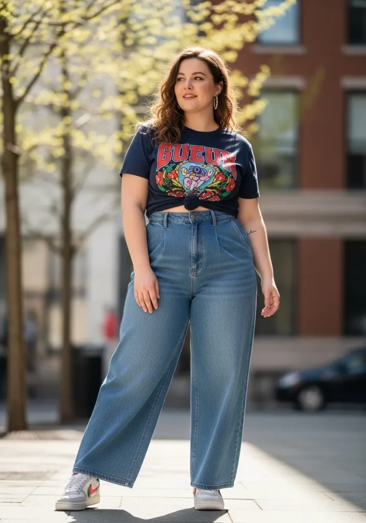A graphic tee styled with wide-leg pants creates a trendy and comfortable outfit that feels modern and easy to wear. The relaxed fit of the pants balances the casual feel of the tee, creating a look that is both stylish and practical. It’s perfect for days when you want something laid-back but still fashion-forward.