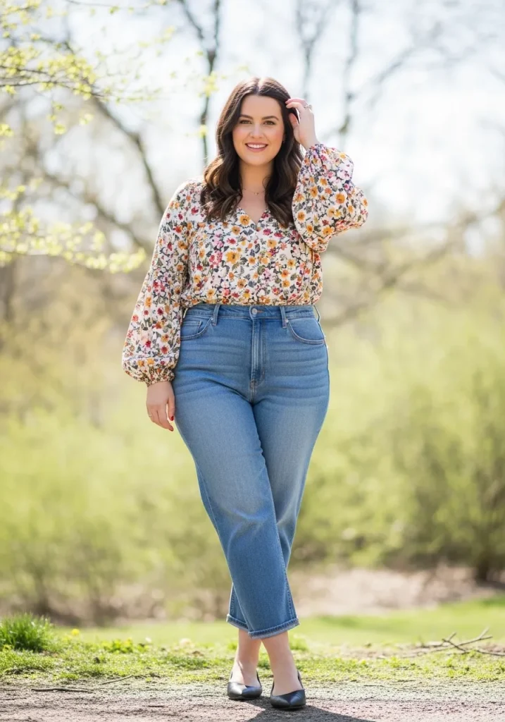 A flowy blouse paired with high-waisted jeans creates a flattering and timeless outfit that works beautifully for spring. The blouse adds softness and elegance, while the jeans provide structure and balance to the overall look. It’s a combination that always feels polished without being too formal.