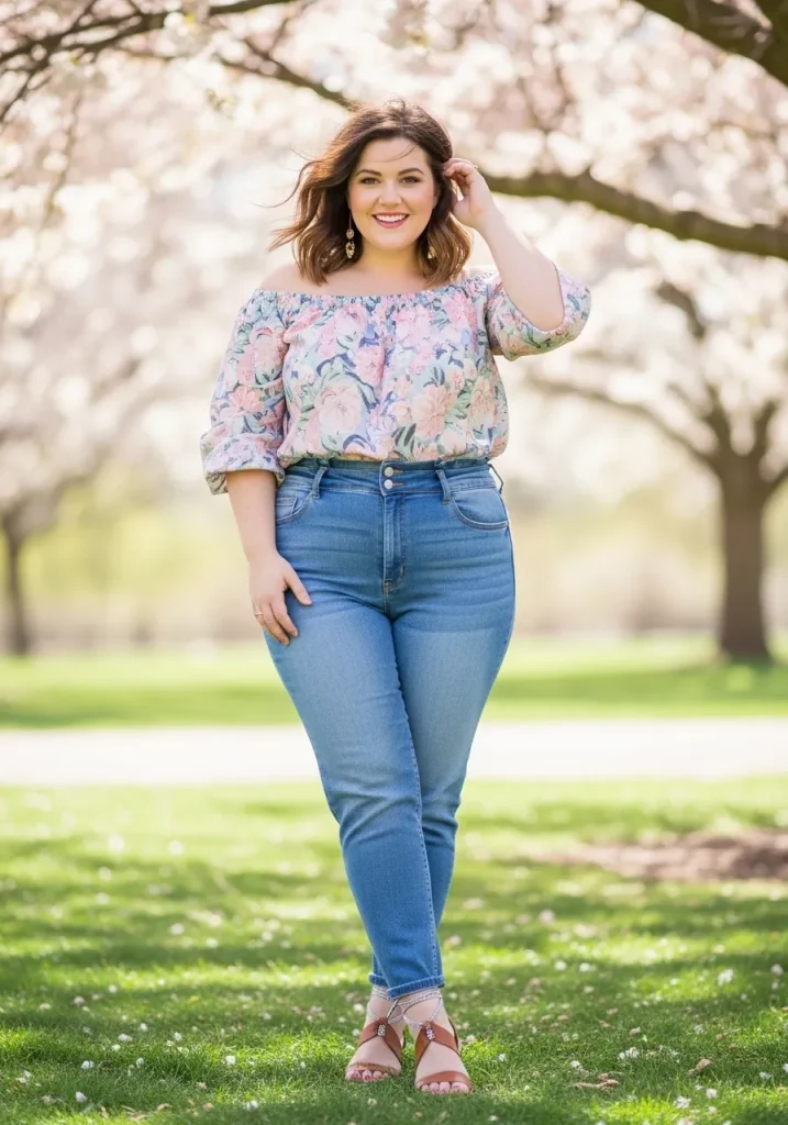 An off-shoulder top paired with jeans creates a soft, feminine look that feels perfect for spring days when you want something light and flattering. The off-shoulder neckline adds a subtle touch of elegance while still keeping the outfit relaxed and easy to wear. It’s a great way to show a little skin without feeling overexposed, making it both stylish and comfortable.