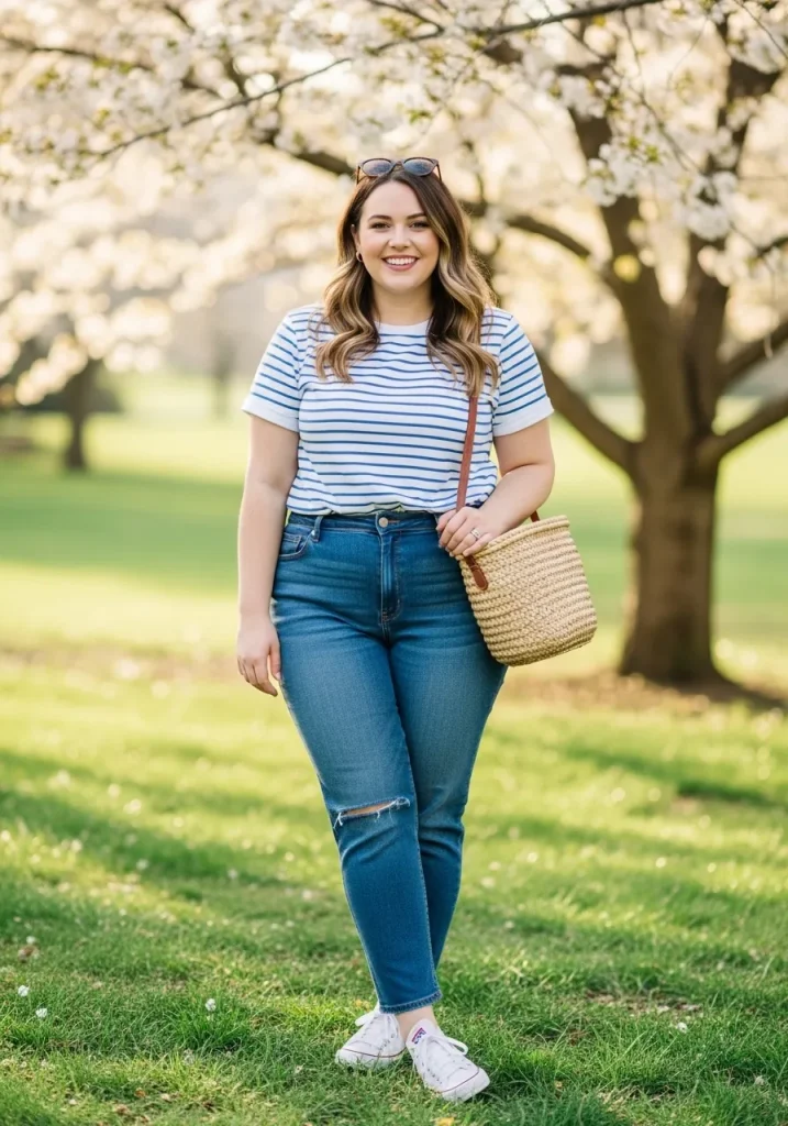 A striped shirt paired with jeans creates a timeless outfit that always looks fresh and stylish in spring. The stripes add visual interest, while the jeans keep the look grounded and easy to wear. It’s a simple combination that never feels boring.
