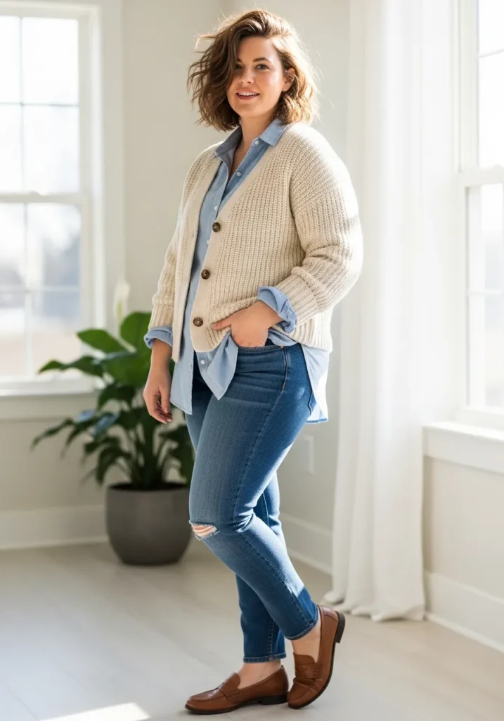 Layering a cardigan over a button-down shirt with jeans creates a relaxed yet polished outfit. The layers add texture while still keeping the look clean and structured.