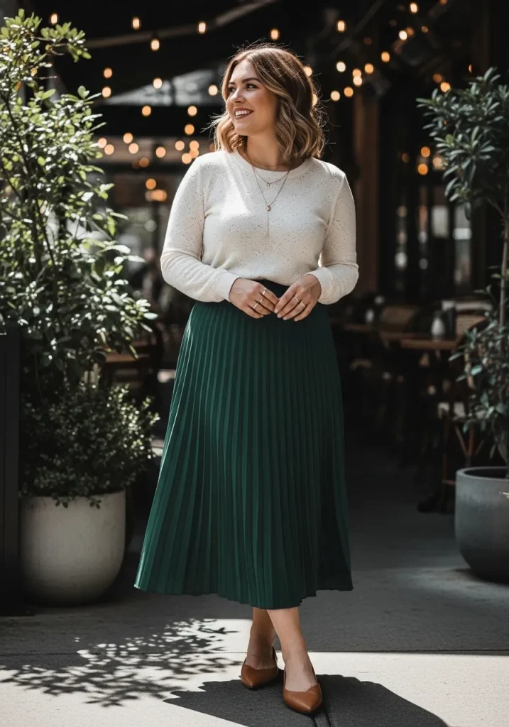 A pleated skirt paired with a knit top creates a soft and feminine preppy outfit. The skirt adds movement while the knit top keeps the look cozy and balanced.