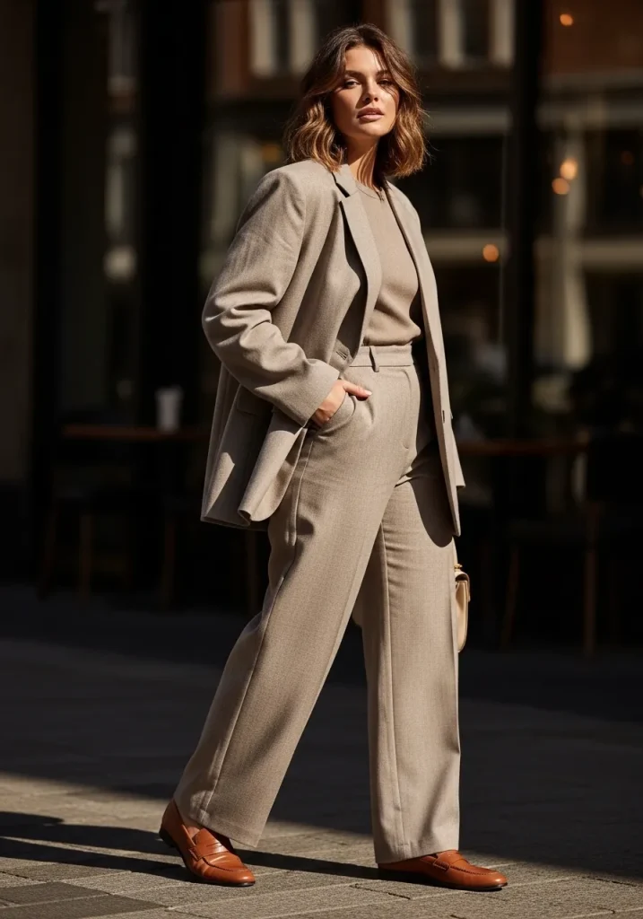 A neutral co-ord set creates a clean and cohesive preppy outfit that feels modern and effortless. The matching pieces make styling easy while keeping the look polished.