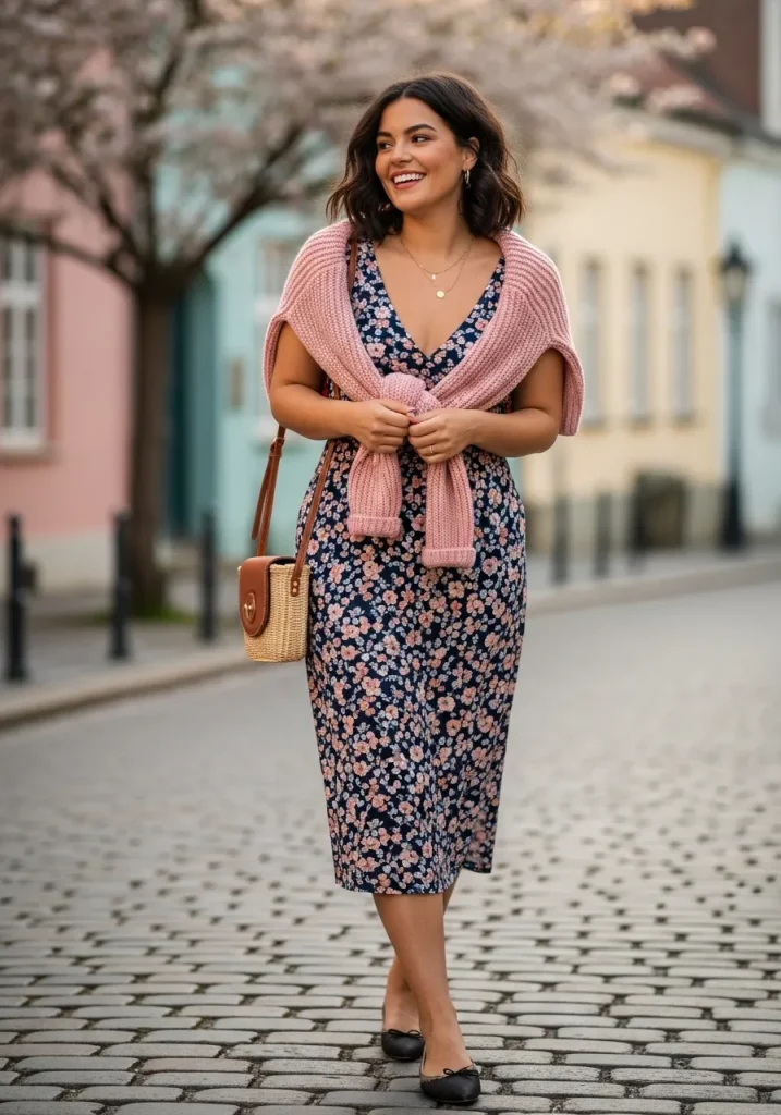 Layering a sweater over your shoulders instantly gives that signature preppy aesthetic. Paired with a midi dress, it creates a soft yet polished look that feels effortlessly chic.