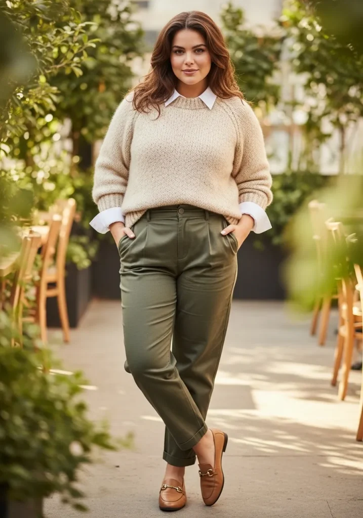 You can pair this with loafers or ankle boots and add a crossbody bag. This outfit is perfect for cooler days or relaxed outings.