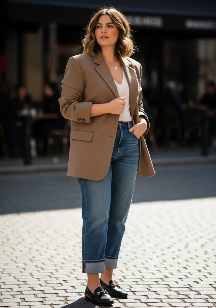 A blazer paired with denim jeans creates a perfect mix of casual and polished. The blazer elevates the relaxed vibe of the jeans, making the outfit feel more refined.