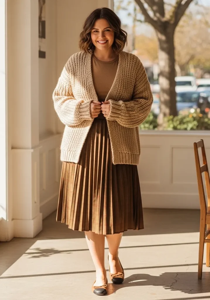 You can button up the cardigan or layer it over a top. Pair with flats or loafers for a complete look. This outfit is perfect for everyday wear.
