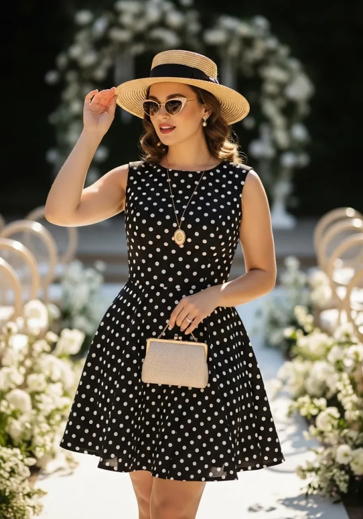 A polka dot mini dress adds a subtle vintage charm that feels both playful and elegant. It’s a great option if you want something a little different while still staying wedding-appropriate.