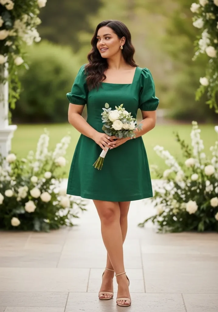 A puff sleeve short dress adds a touch of drama while still maintaining a soft, romantic feel. The volume in the sleeves creates a balanced silhouette, making the dress look more elevated and special for a wedding setting. Light fabrics and pastel shades help keep the outfit airy and summer-ready.