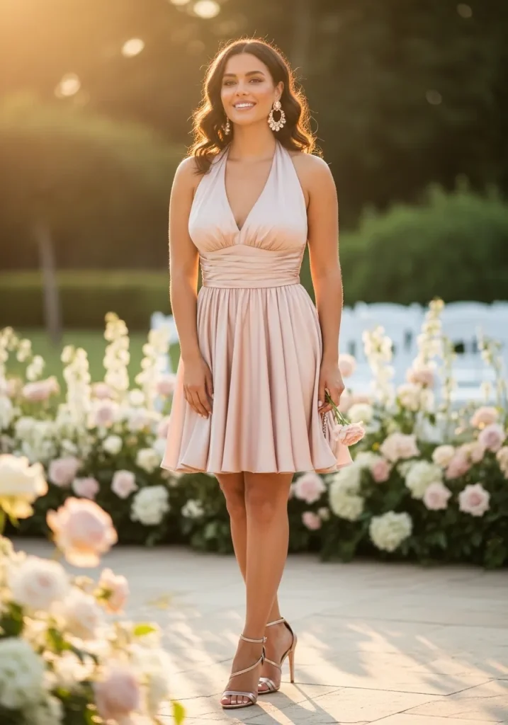 A halter neck short dress is a great option if you want something slightly more elevated while still keeping things light. The neckline draws attention to your shoulders and adds a sleek, flattering touch to the overall look.