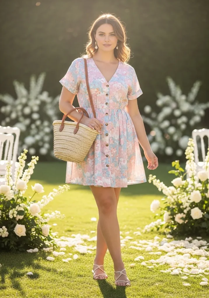 Keeping jewelry minimal allows the fabric and silhouette to stand out. Pair it with strappy heels and a small clutch to complete the look. This outfit works especially well for evening weddings or more formal summer celebrations.