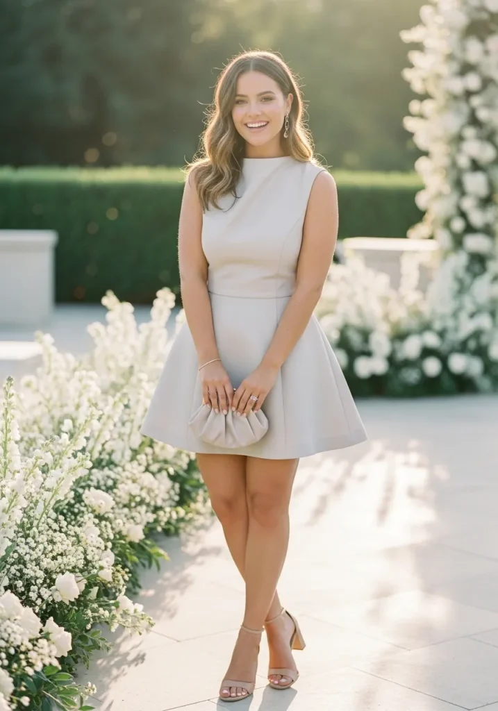A monochrome light-tone mini dress creates a clean and cohesive look that feels modern and effortlessly chic. Choosing shades like ivory, blush, or soft beige keeps the outfit light and perfect for summer.