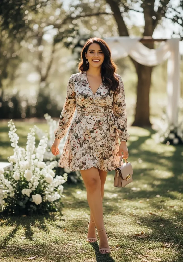 A wrap mini dress is universally flattering and perfect for creating a soft, feminine silhouette. The wrap detail defines your waist while keeping the dress comfortable and easy to wear throughout the event. Lightweight fabrics and soft colors make it ideal for summer weddings.