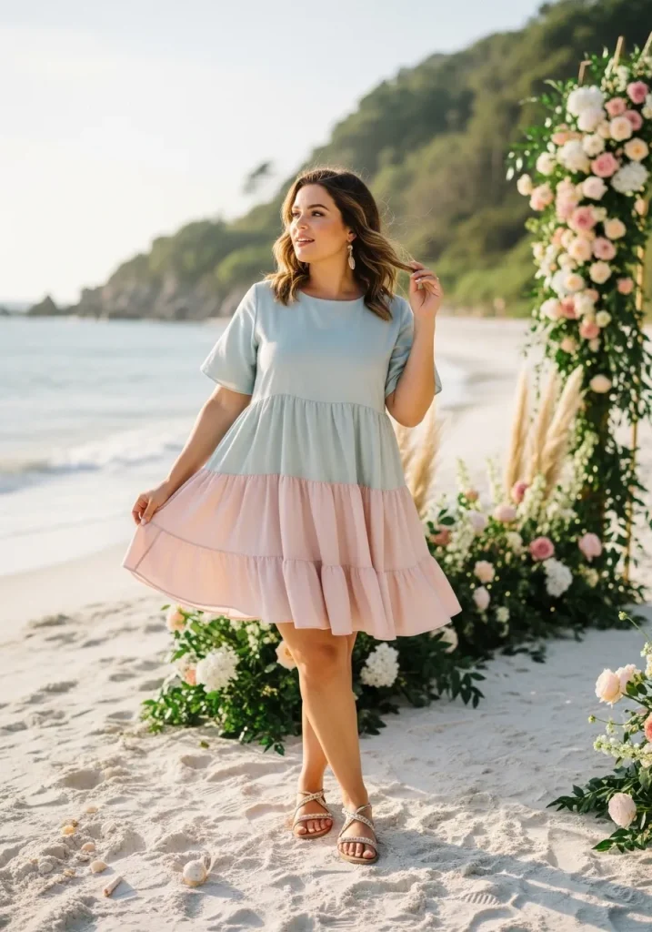 Pairing it with simple sandals keeps the look comfortable and easy to wear. You can add a small crossbody or clutch and subtle jewelry to complete the outfit. This is a great option for outdoor or beach weddings where comfort is key.