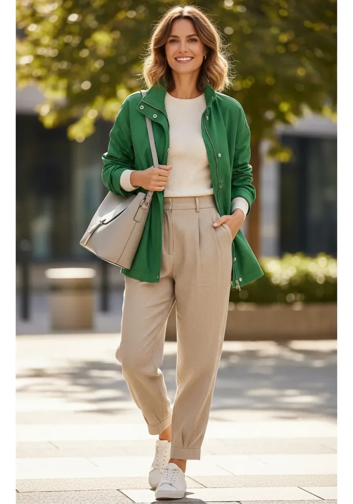 One of the standout colors for spring 2026 is green. Whether it’s a vibrant emerald or a soft sage, a green spring jacket adds a refreshing pop of color to your wardrobe. This shade pairs wonderfully with neutral tones and works well for both casual and business casual outfits. A green jacket can be worn as a statement piece or incorporated into a simple styling outfit to bring some vibrancy to your overall look.