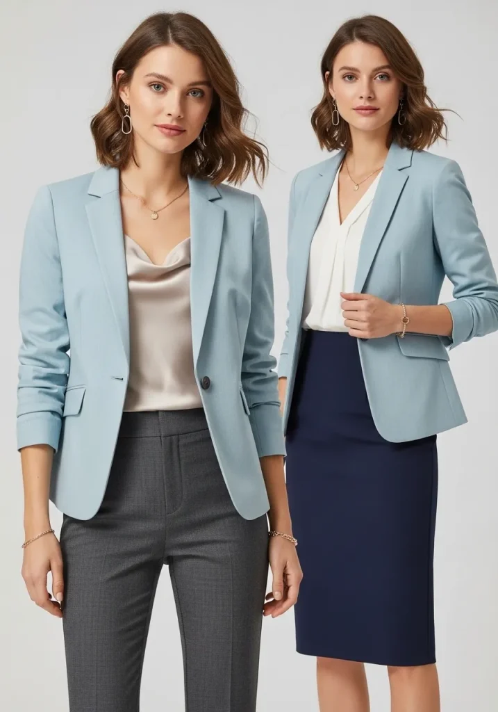 For women looking to create stylish office looks, pair a blazer with tailored trousers or a pencil skirt. These outfits are ideal for those who need to maintain a professional appearance while staying comfortable throughout the day. The blazer will remain a classic choice for both business casual spring jacket outfits and casual work outfits, ensuring that you always look polished and put together.