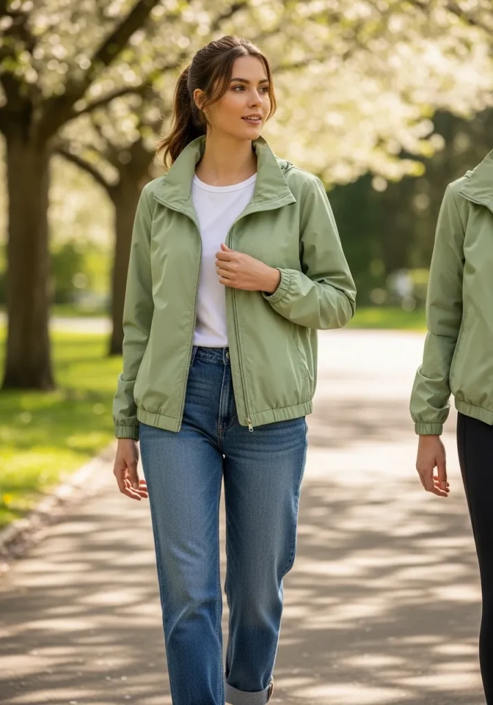 When the weather gets breezy, a windbreaker women’s outfit is perfect for maintaining comfort without sacrificing style. Windbreakers are lightweight, easy to pack, and come in a variety of colors, making them ideal for spring activities. Whether you’re hiking, running errands, or simply enjoying a casual day out, this jacket will keep you protected from the elements without being too bulky. A windbreaker in a neutral tone or pastel shade is an excellent addition to any spring wardrobe, allowing you to pair it with your favorite spring jacket outfit or even a casual work outfit.