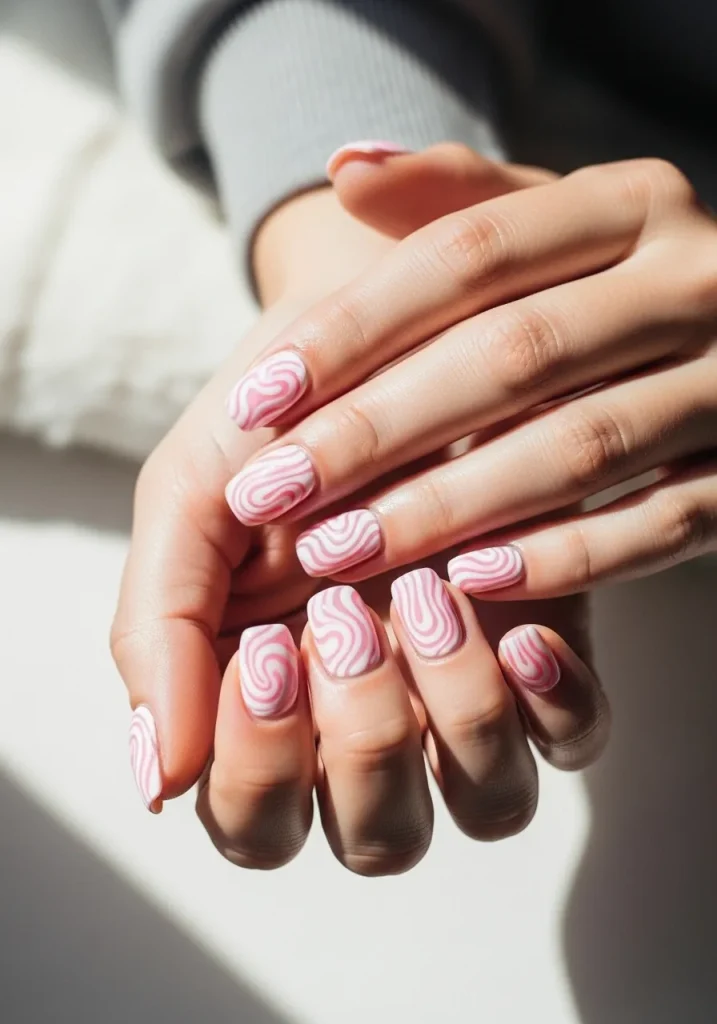 Pink and white swirl nails create a soft, flowing design that feels artistic and trendy. The swirling patterns add movement and dimension to your nails, making them visually interesting without being too bold. It’s a perfect mix of playful and elegant.