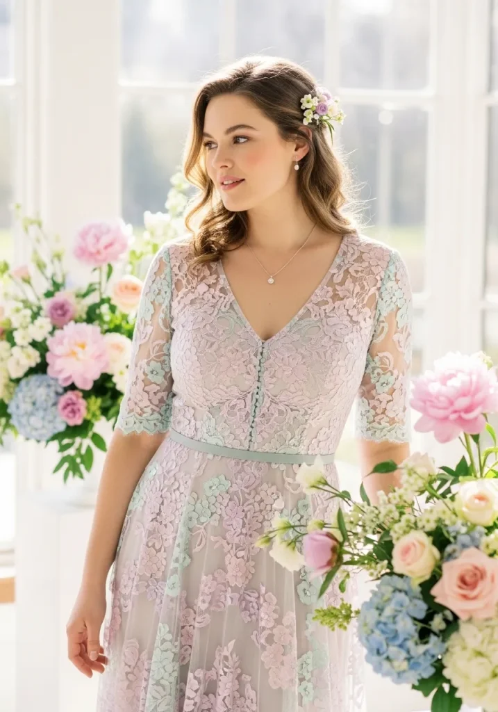 A delicate dress suitable as a Bridal Shower Dress Guest outfit can also be perfect for intimate spring weddings. Think soft lace, subtle florals, or feminine silhouettes that feel polished without being overly formal. Light colors such as blush, cream, or lavender enhance the romantic vibe.