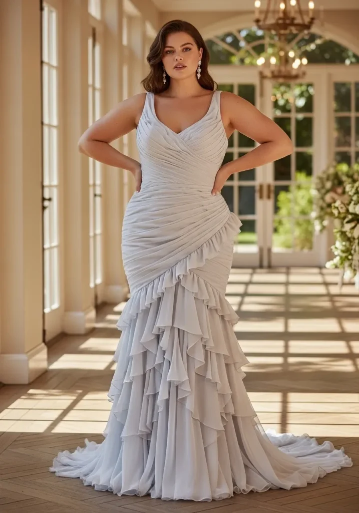 A Fitted Fairy Dress With Ruffles For Spring blends whimsical texture with a flattering shape. The fitted bodice defines curves while soft ruffled layers add movement and romantic charm. This balance makes it ideal for semi-formal or garden weddings.