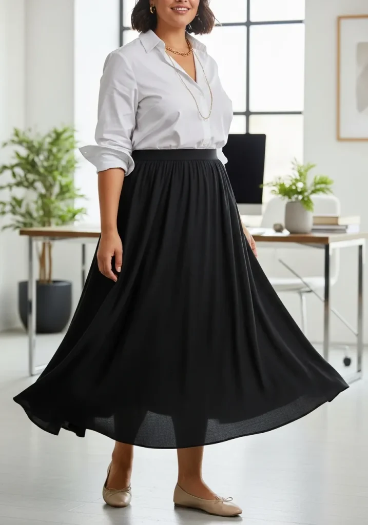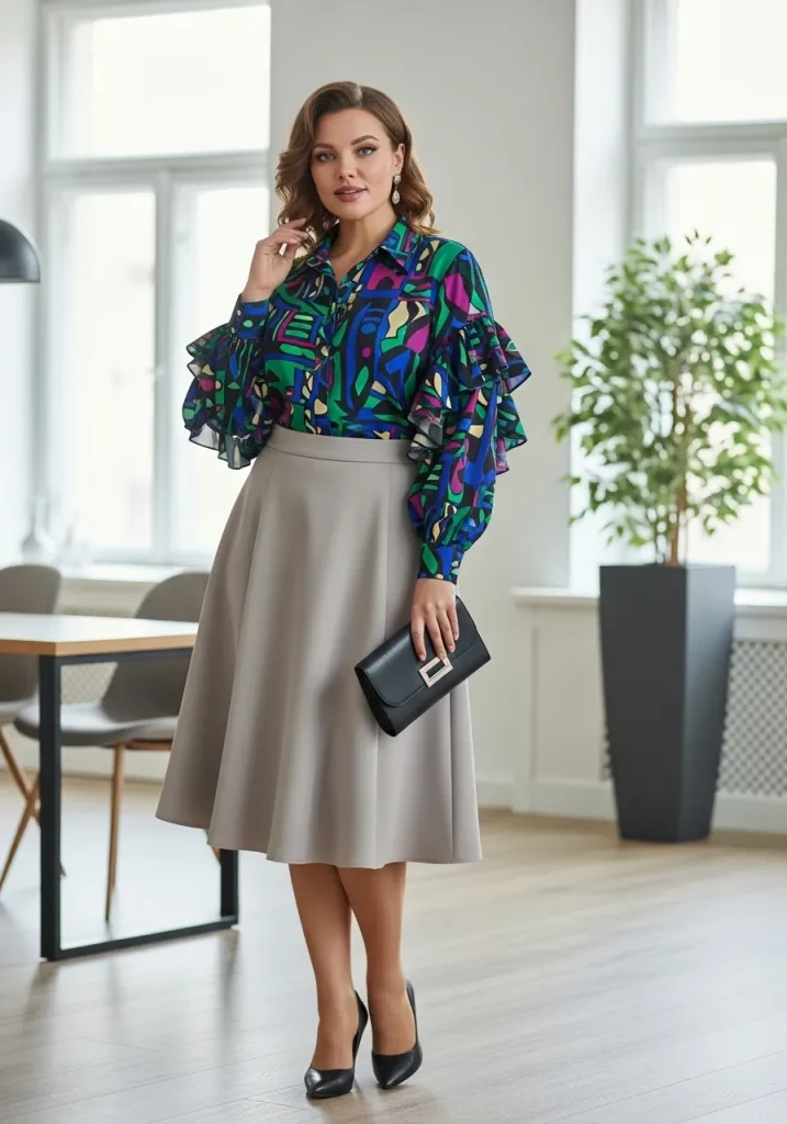 When styling this look, opt for neutral-colored accessories to allow the blouse to stand out. A pair of classic pumps or smart flats works well to complete the outfit, providing comfort while maintaining professionalism. This combination is versatile enough for client meetings, presentations, or everyday office wear. With the right statement blouse and A-line skirt, you’ll be ready to conquer the workday in style.