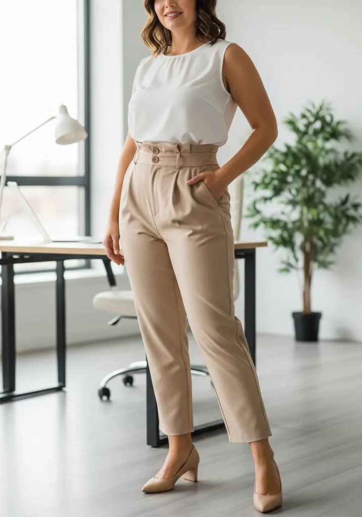 Paperbag waist pants are a trendy and comfortable option for office wear, and they pair perfectly with a fitted blouse. The paperbag waist adds structure and definition to the waistline, while the loose fit through the legs offers comfort and ease of movement. This style is ideal for those who want to add a bit of fashion-forward flair to their office wardrobe. Choose pants in a neutral tone such as beige, navy, or black to keep the look office-appropriate. Pair them with a fitted blouse tucked into the waistband for a balanced, chic silhouette.