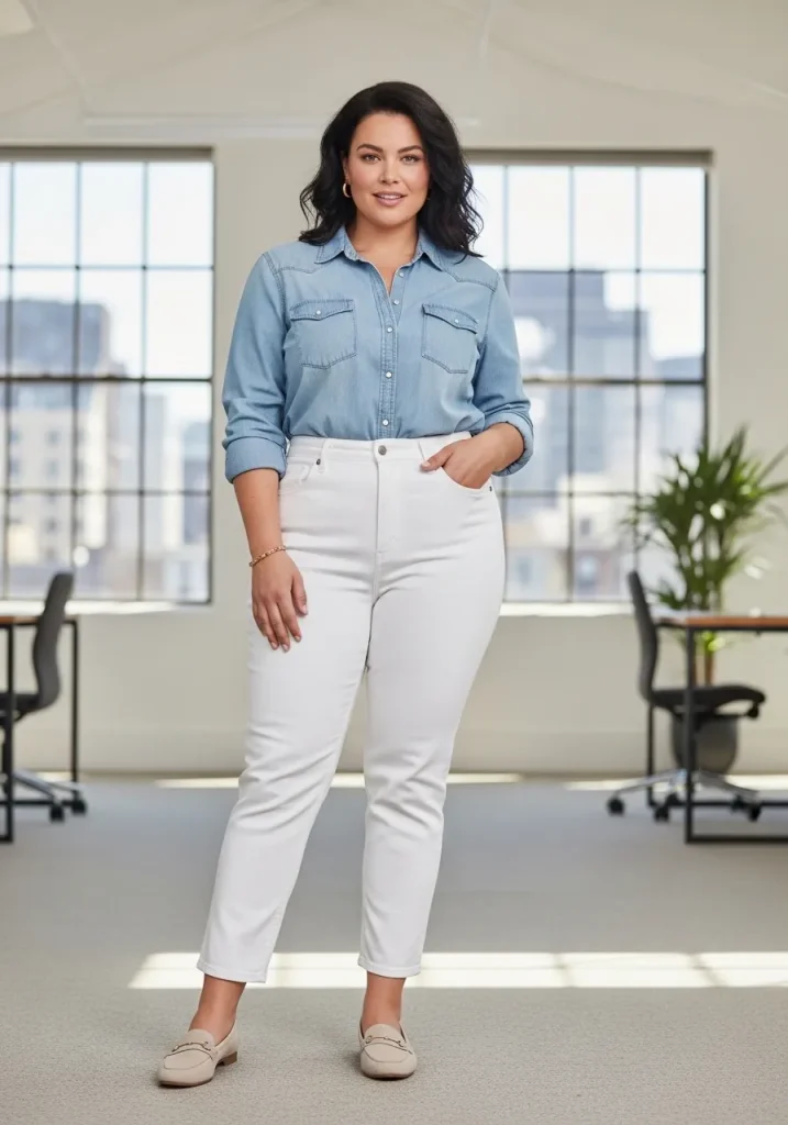 For a more casual office look with a touch of sophistication, a chambray shirt paired with white jeans is a fantastic choice. The chambray shirt, with its soft denim-like fabric, offers a relaxed yet polished vibe. White jeans bring a fresh, crisp look to the outfit, providing a clean base to complement the chambray shirt. This combination is perfect for casual Fridays or a laid-back office day when you still want to maintain a professional appearance.