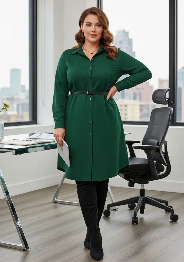Choose a shirt dress in a solid color or subtle pattern, and pair it with sleek black over-the-knee boots for a chic, powerful look. This outfit can easily take you from the office to an after-work gathering with minimal effort. Add a leather bag and a simple watch to complete the look.