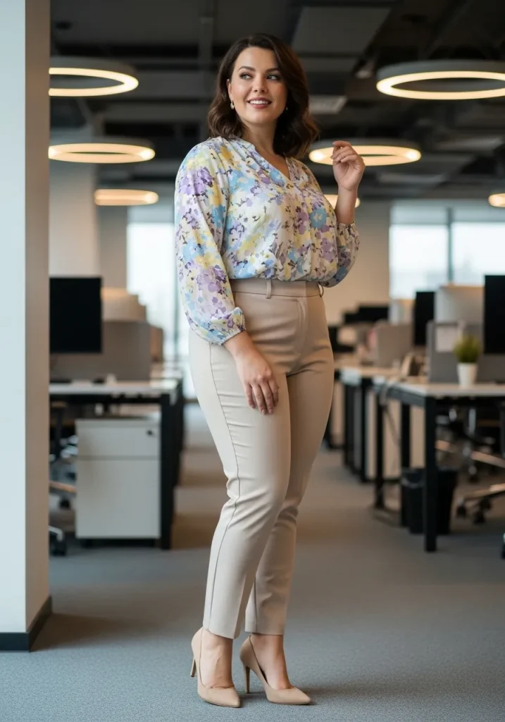 For a polished finish, tuck the blouse into the pants and add a sleek belt to define your waist. Pair the look with neutral-colored heels or flats for a chic and understated look. This outfit is perfect for a day filled with meetings or a more casual day at the office. If you want to layer up, a light cardigan or blazer will complement this outfit beautifully. Floral prints bring a sense of freshness to your office wardrobe, making it a spring favorite.
