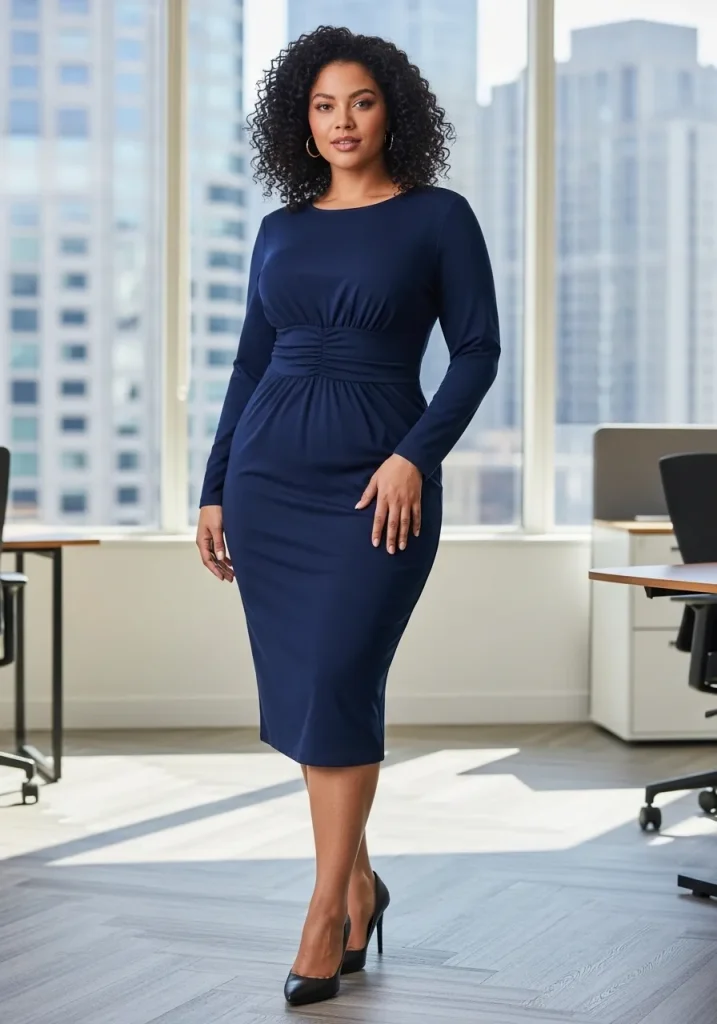 For a complete look, pair this outfit with ballet flats or low heels to ensure comfort throughout the day. Add a slim belt to further define the waist and a simple necklace for added elegance. This style is timeless and versatile, making it a great addition to your office wardrobe.