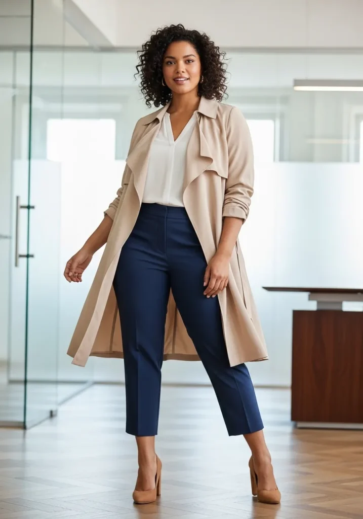 For those spring days when the weather is unpredictable, a lightweight trench coat paired with cropped pants is the perfect go-to. The trench coat, known for its chic and timeless appeal, provides just the right amount of coverage without being too heavy. Opt for a beige or light neutral-colored trench to keep the look fresh and spring-appropriate. Pair it with cropped pants that hit just above the ankle, offering a modern, stylish twist to a classic office look. The cropped pants add a bit of casual flair while still maintaining a professional feel.