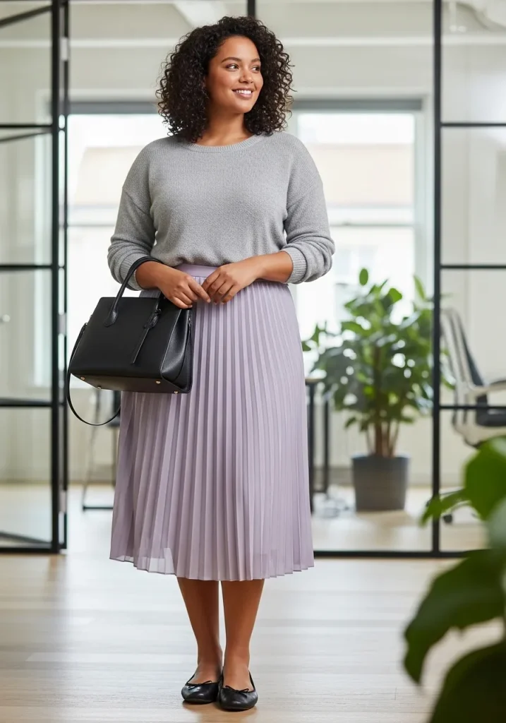 This outfit is great for casual Fridays or any day when you want to bring a bit of fun and femininity to your office wear. The pleated skirt adds a touch of elegance, while the knit sweater keeps the look relaxed and comfortable. Pair it with ankle boots or ballet flats to complete the look. A statement handbag or scarf can also add some personality to the outfit. This combination ensures you stay stylish, warm, and comfortable throughout your day at the office.