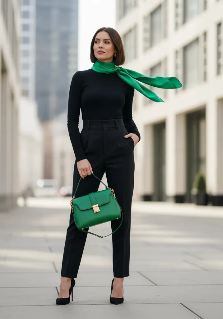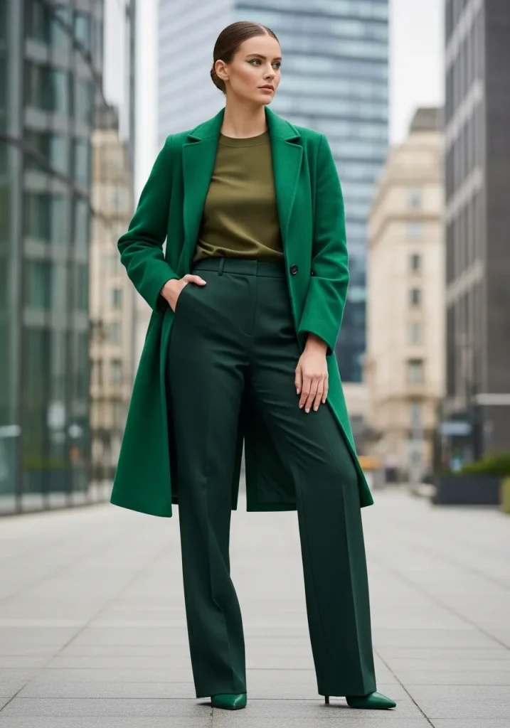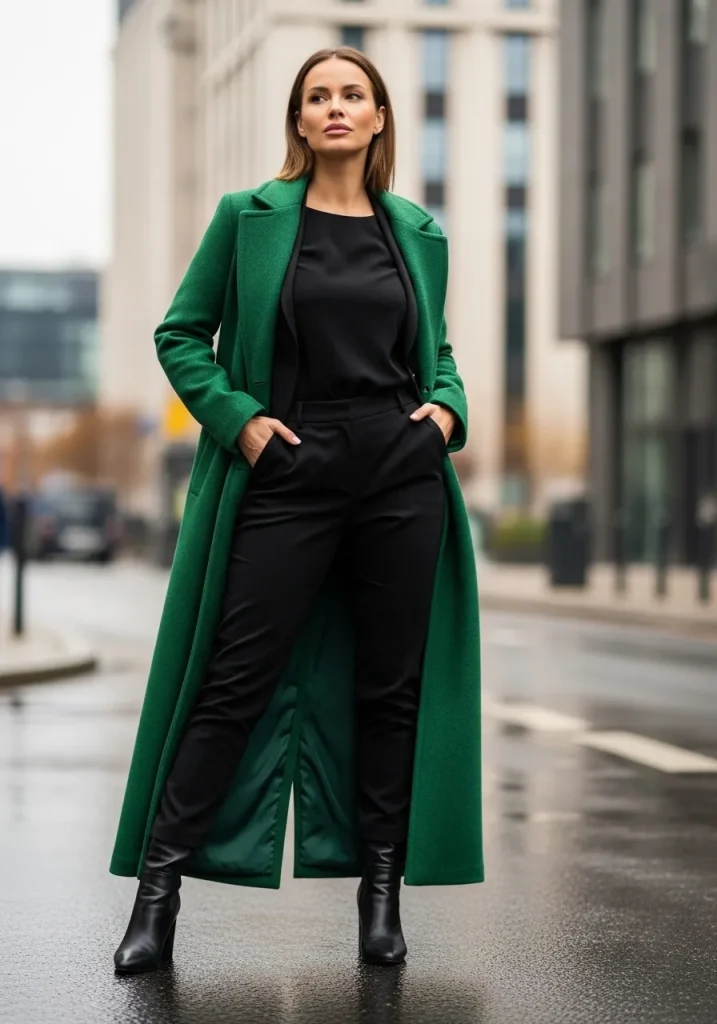 If you prefer minimalist styling, an all-black base topped with a bold green coat creates a striking Emerald Green Outfit that feels both dramatic and refined. The dark foundation allows the coat to stand out as the focal point while maintaining a sleek silhouette. This approach transforms a simple outfit into a Trendy St Patricks Day Outfit instantly.